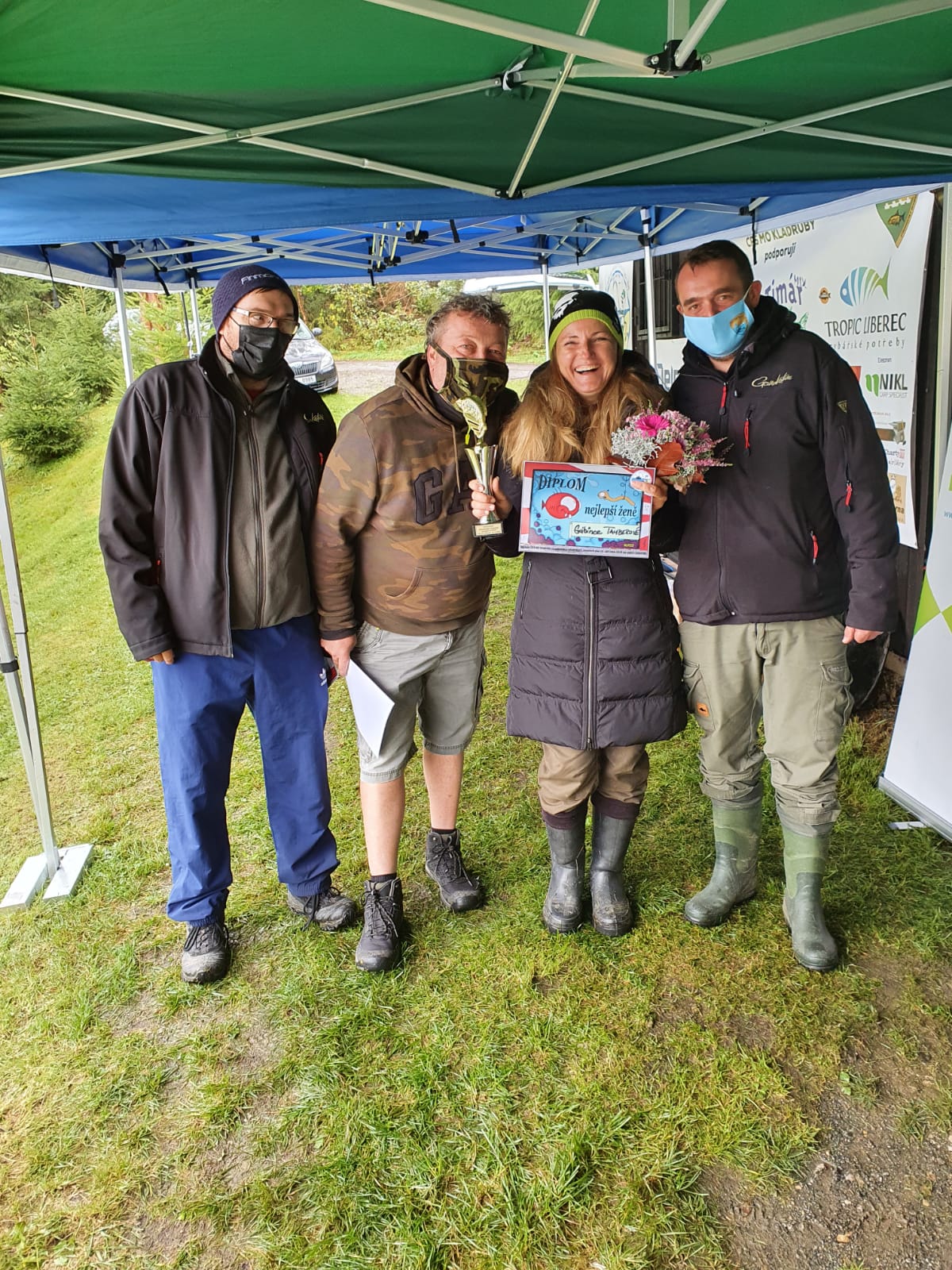 Po ukončení závodu se všichni zahřáli pečeným masem z lorny, které připravili naši vrchní „grillmani“ Kletečkové a po kratším sečtení ulovených ryb jsme mohli přistoupit k vyhlašování výsledků. Cenu za nejlepší ženu si odnesla stálice startovního pole Gábina Tauberová, která vyhrála vše, co šlo…kromě nejlepší ženy získala zaslouženě i zlatou medaili za první místo v závodě a ulovila též největší rybu. Abychom ji tolik nerozmazlili množstvím cen, cenu za největší rybu jsme předali Zdeňkovi Hamouzovi za ulovenou rybu nejmenší. Stříbrnou medaili vybojoval novic mezi reprezentanty ČR v plavané a jednatel ČRS MO Kladruby, Petr Krym, který v nedělních dětských závodech asistoval Adélce Procházkové, která svou kategorii vyhrála. Stříbro bral náš kamarád Martin Havlíček ze Zbiroha. Gratulujeme tentokráte nejen medailistům, ale především vozíčkářům a všem zúčastněným, kteří jsou v tomto extrémním počasí v našich očích vítězi!